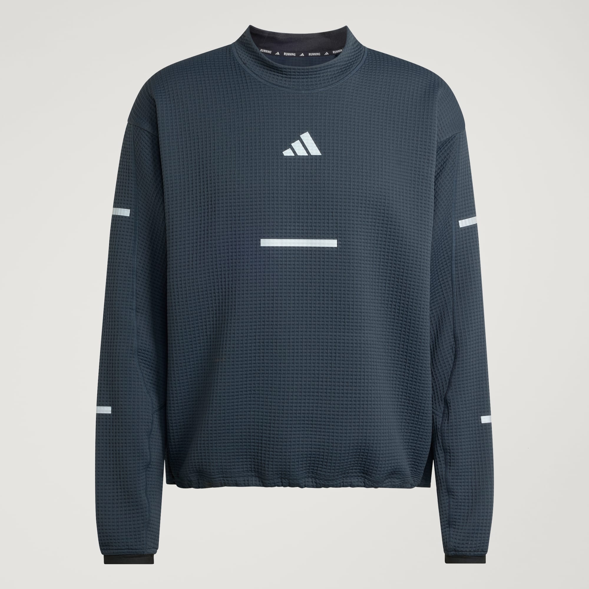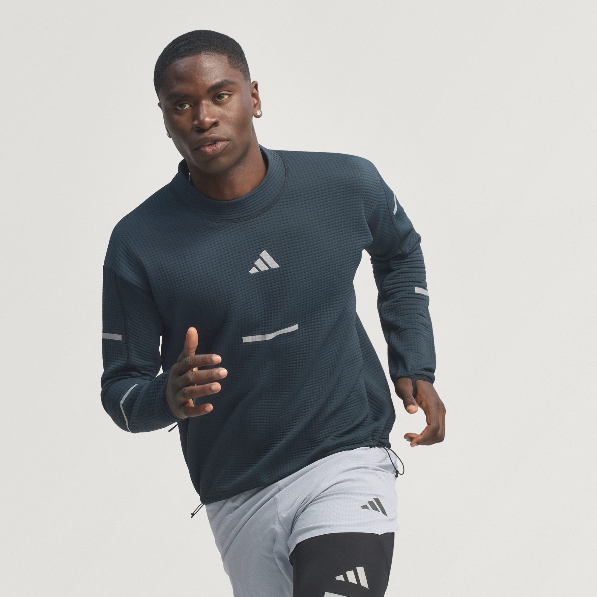 365 days of the year. Hot or cold. You lace up your shoes and get out there. On the cold days, this adidas running crewneck helps you stay comfortable. It's made with CLIMAWARM+ and is designed to layer. The fabric's waffle structure helps channel air to your skin to help regulate body temperature, while thumbholes help you keep your hands warm. CLIMAWARM+ advanced insulation provides superior engineering with advanced materials that unite for warm, dry and focused performance. Insulating materials trap warmth for optimal body temperature.