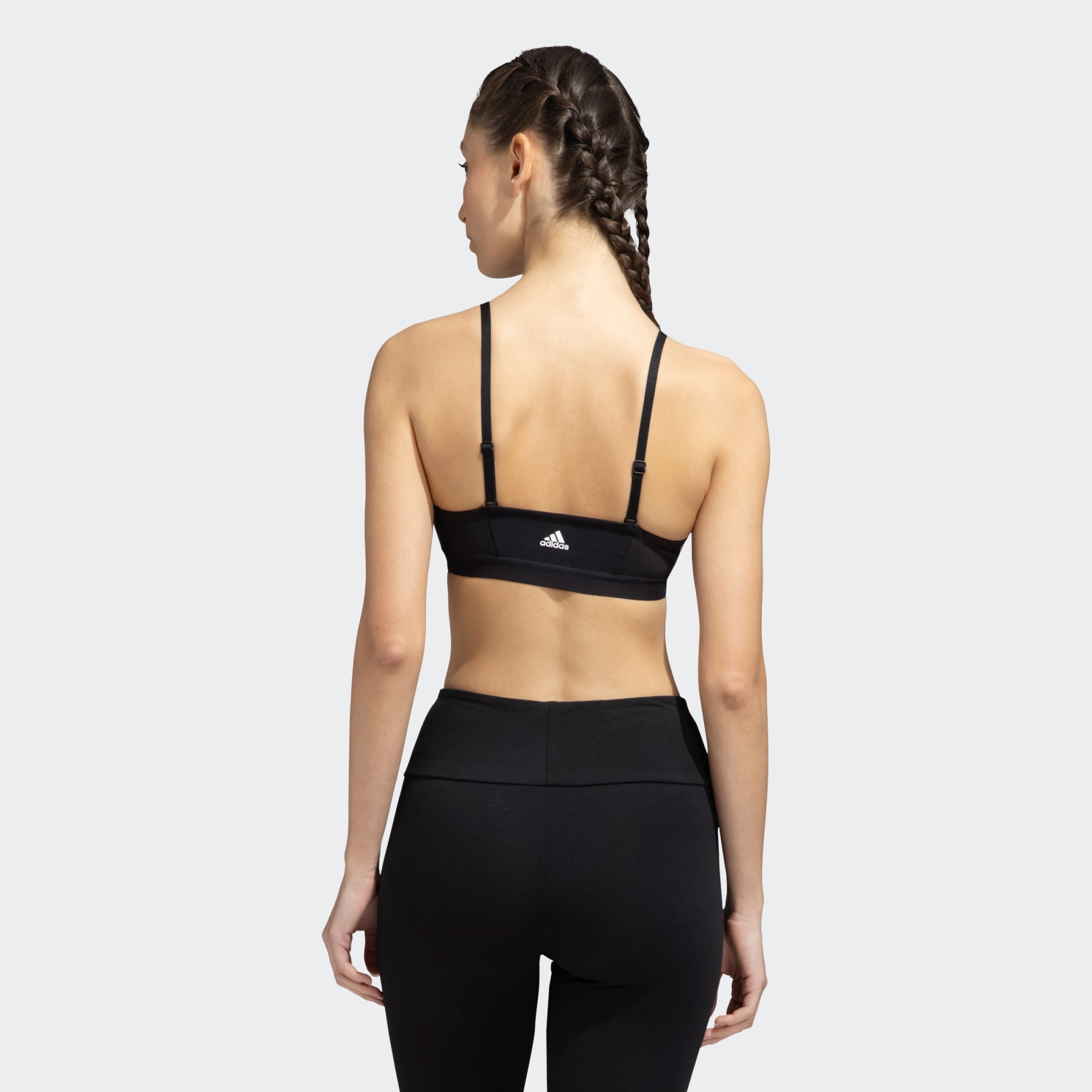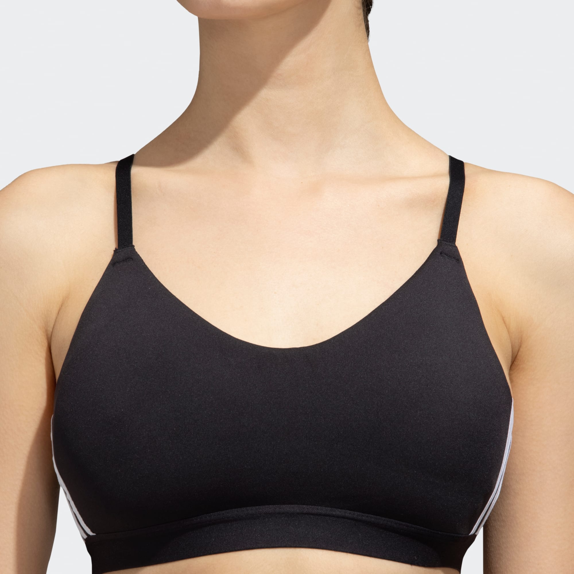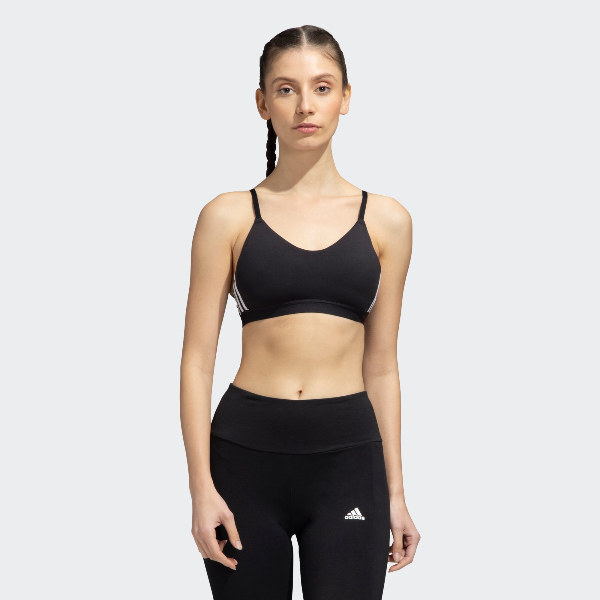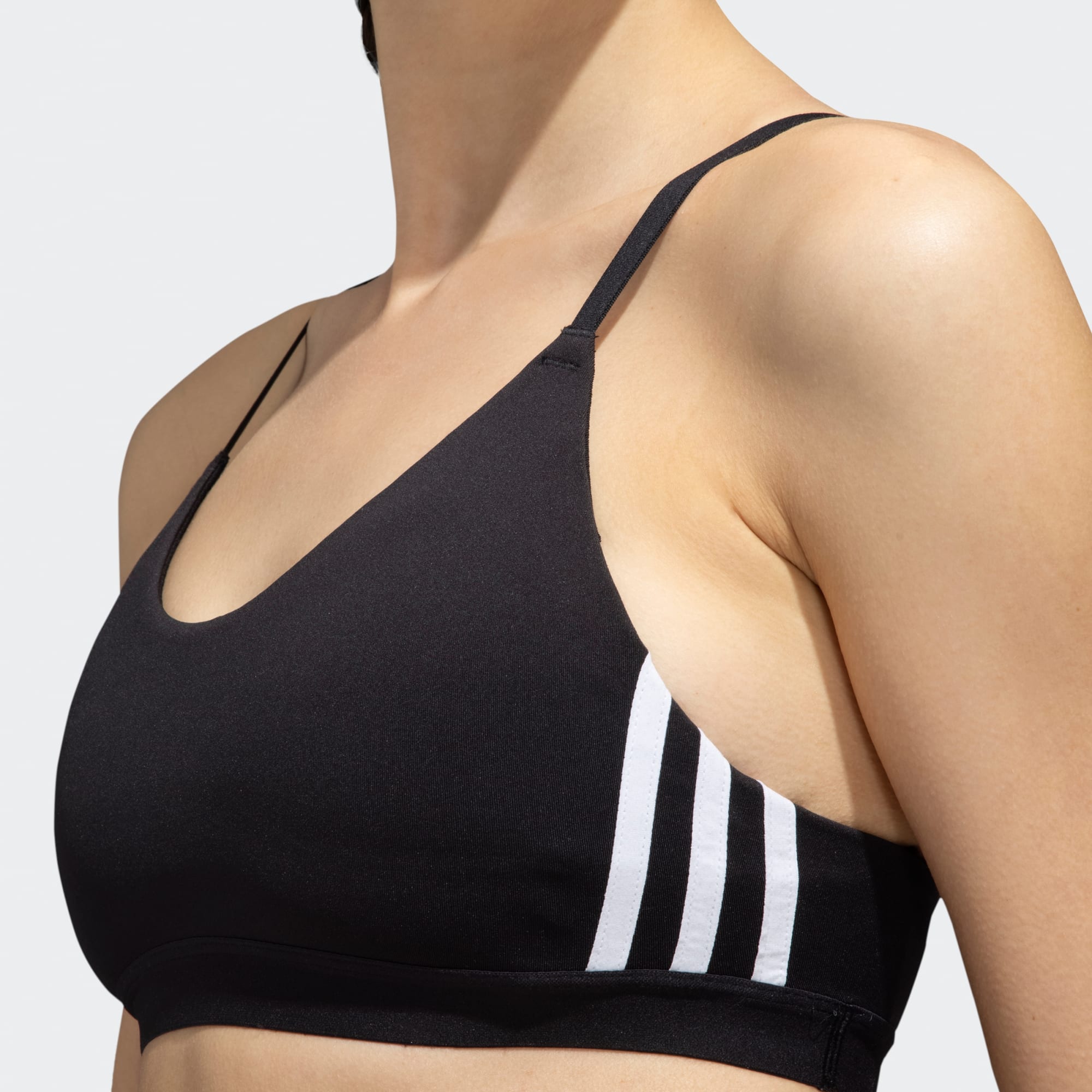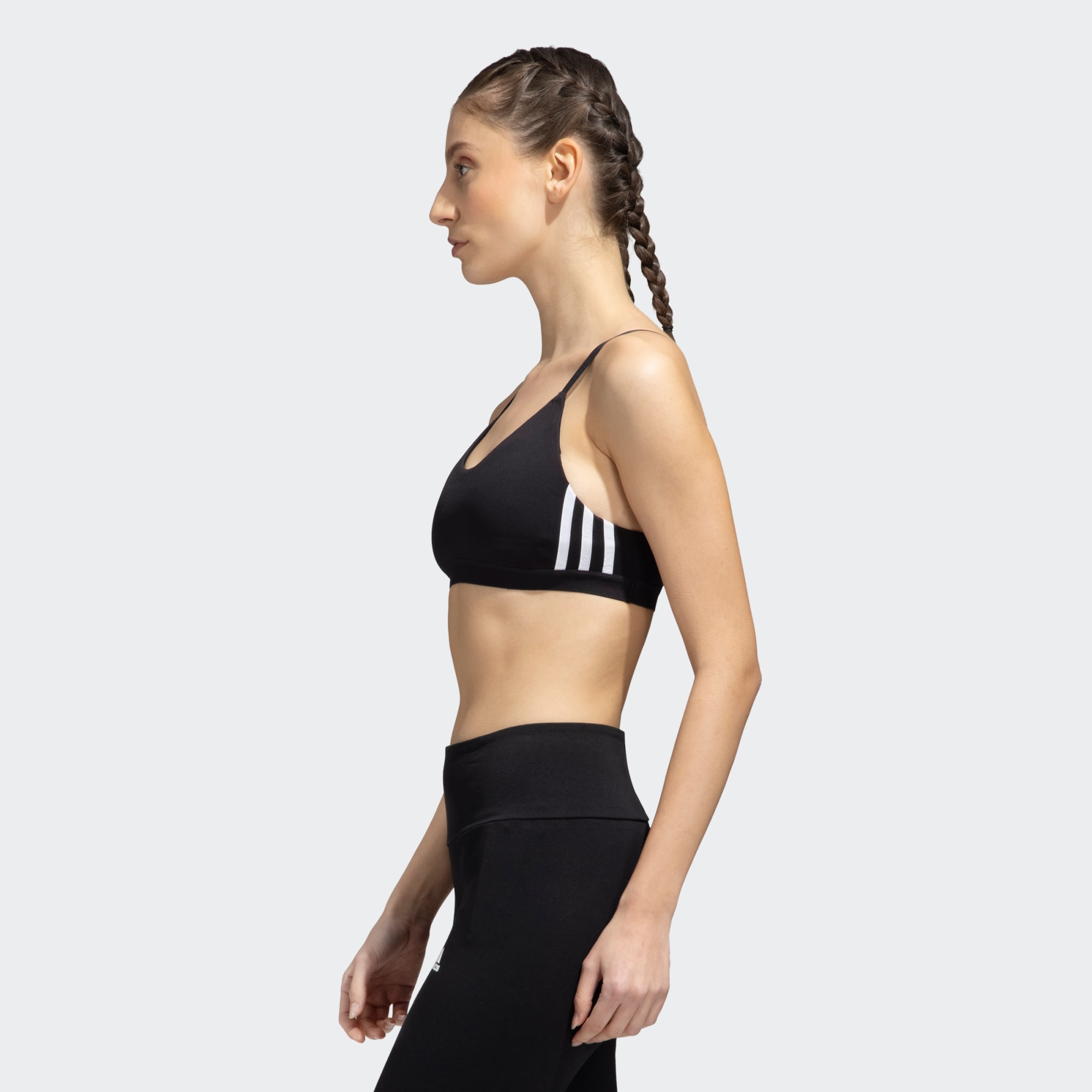 Step onto the mat and enter a higher space. This super-soft sports bra is made to empower your daily workout. Transition gracefully from allongée propellers to glute burners, free from distractions. Whether you're back at your favourite yoga school, or experimenting with a Pilates or barre class, the All Me 3-Stripes Bra has got your back. Change in pace? Our supple woven fabric is designed to stretch – and breathe – with you. Explore that extra twist in Ardha Matsyendrasana whilst staying snug and dry.