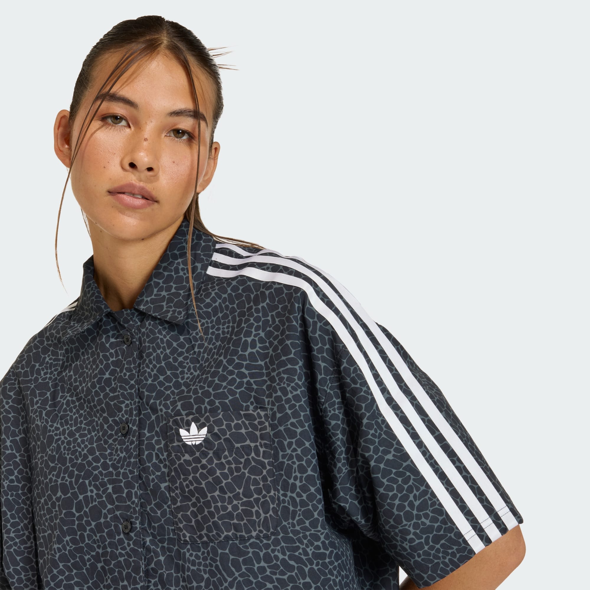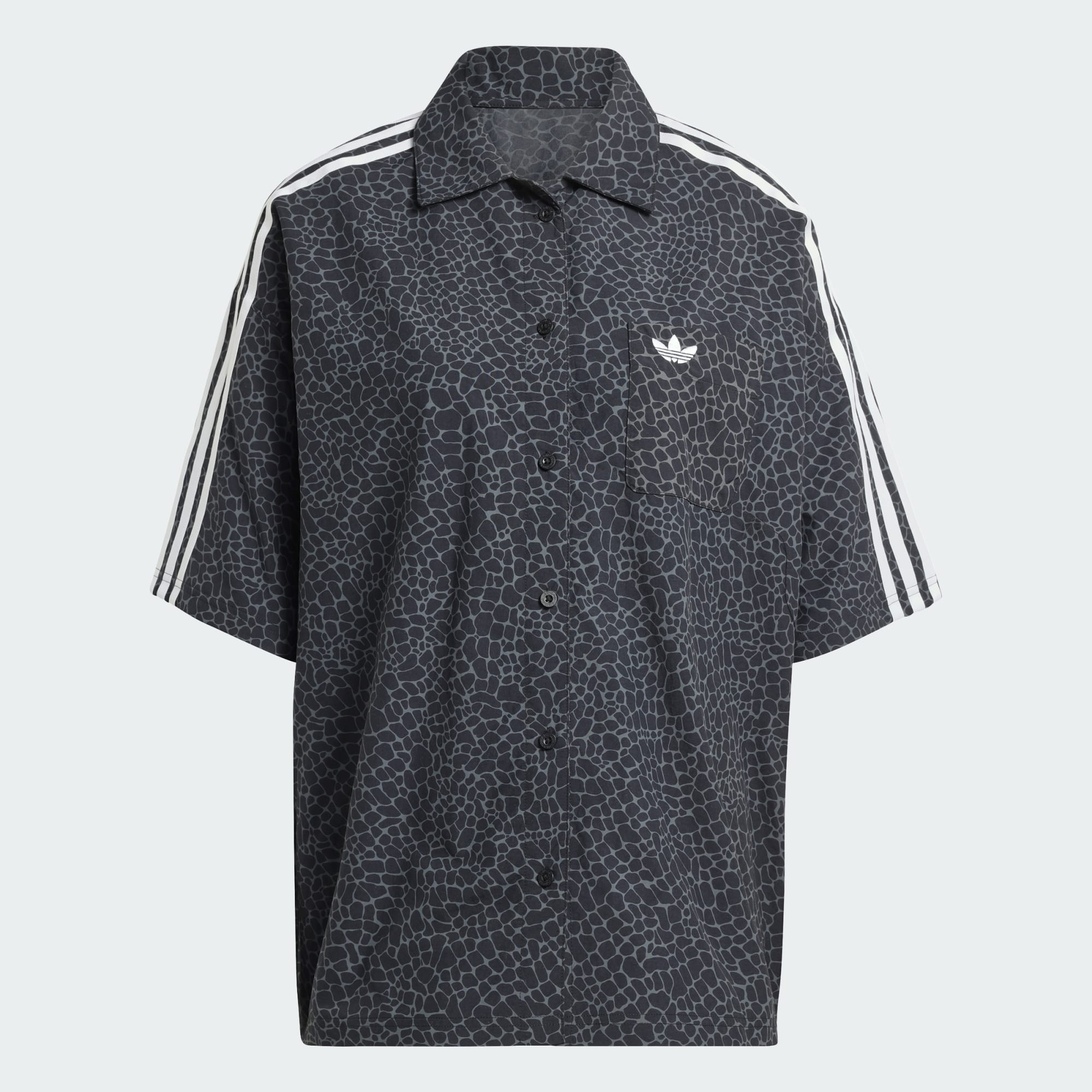 Make a statement with the adidas AOP Short Sleeve Shirt, inspired by classic streetwear. With its bold animal print influenced by the Predator shoe's design, it combines fierce patterns with classic streetwear vibes. Crafted from plain weave material, the shirt offers an oversized fit that provides comfort with a relaxed look. The V-neck design adds a touch of elegance, wearable for many casual outings. Whether you're relaxing at home or hanging out with friends, this shirt is an excellent choice for a fashionable and comfortable experience. Look good and feel good as you go about your day.