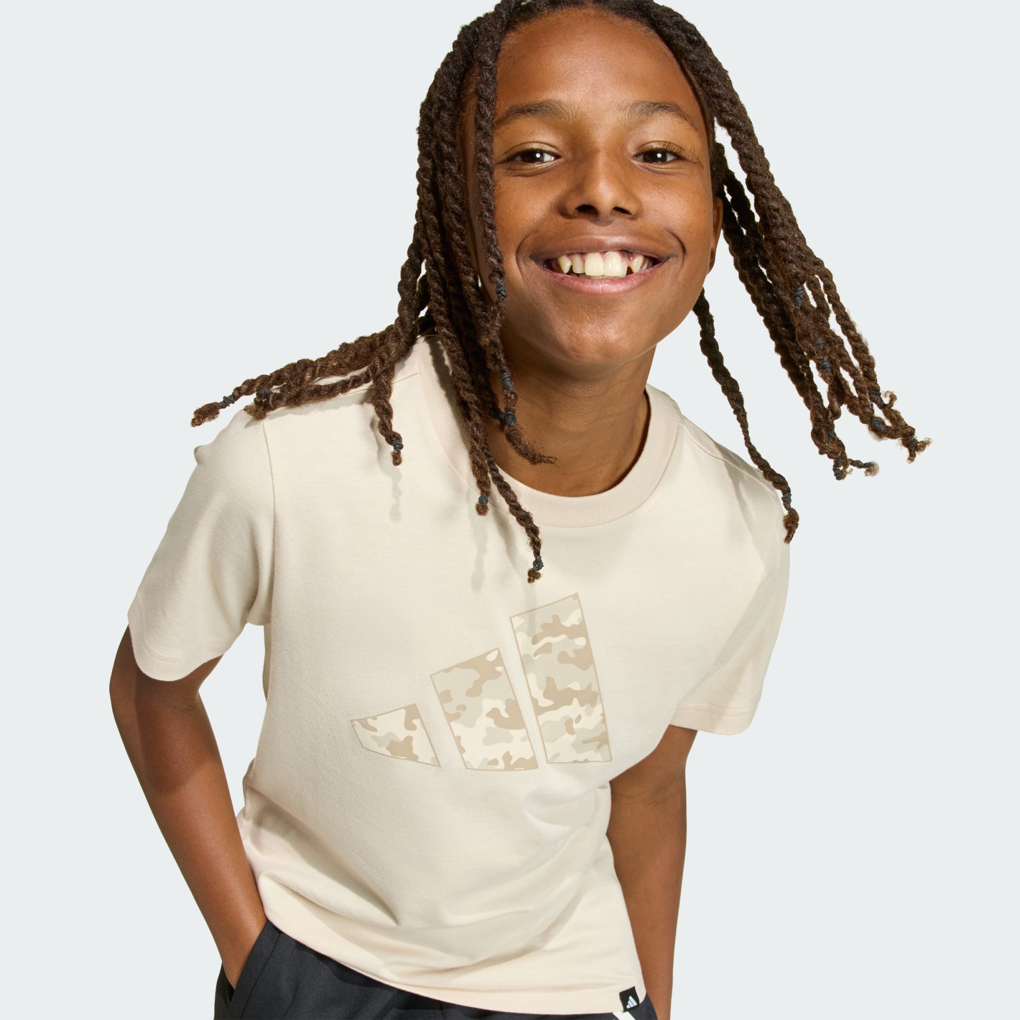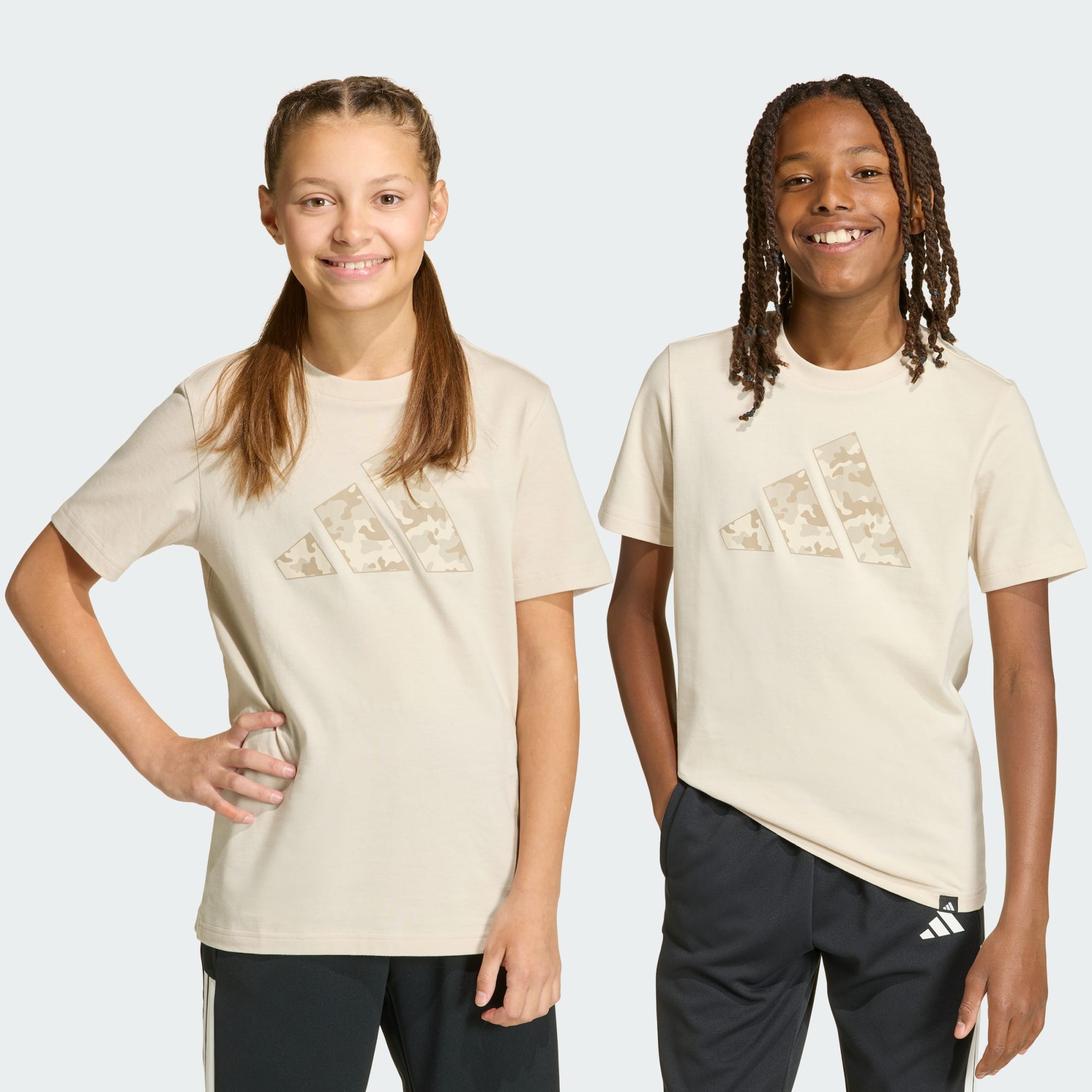 An adidas cotton logo tee with stealthy camo identity.