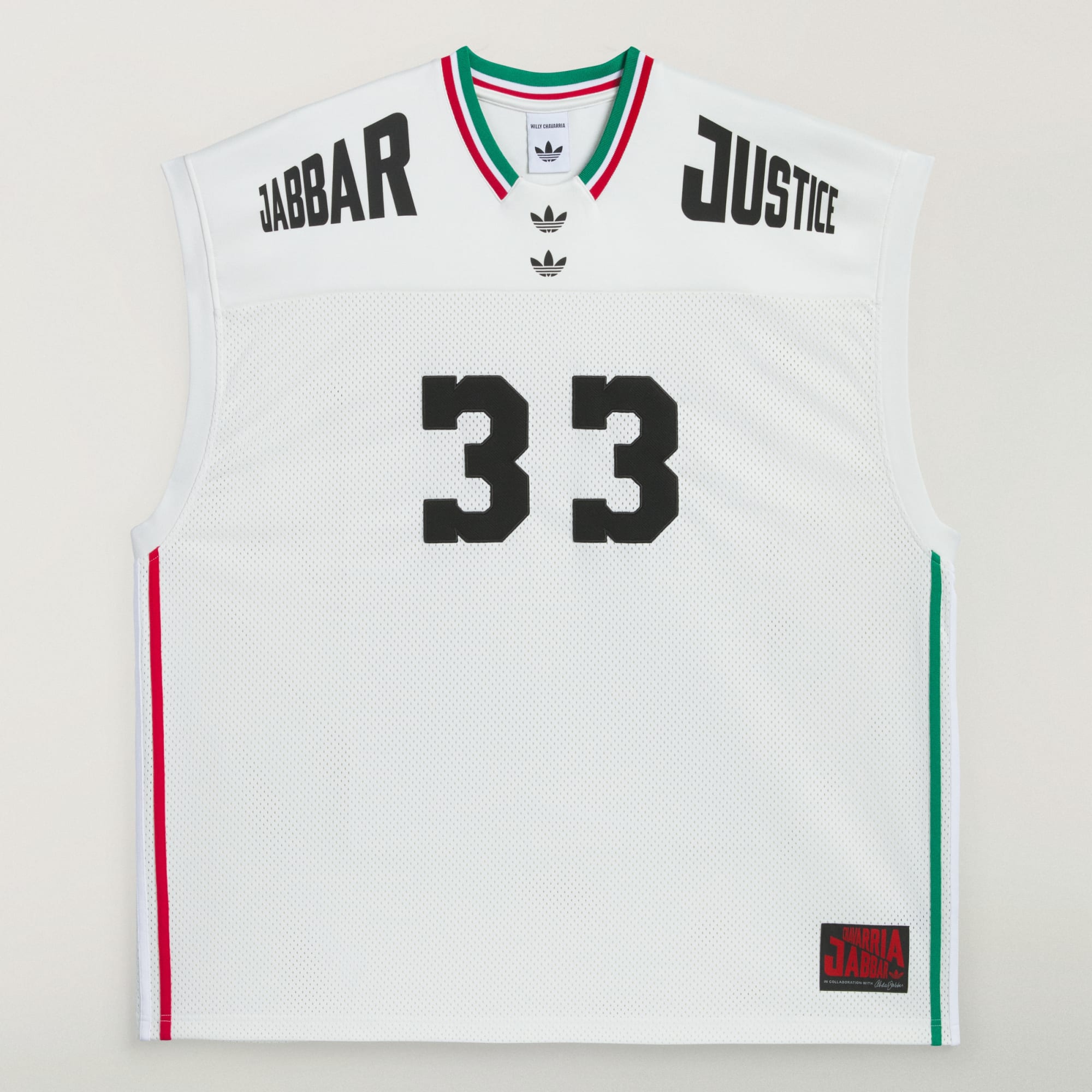 The Chavarria Basketball Jersey is elevated in a mix of heavyweight mesh and double knit spacer fabric to provide exceptional quality and comfort. The basketball jersey is designed with voluminous proportions in the body. Functional details include a ribbed three-stripe collar. Branding is symbolized through embroidered double trefoils on the center front chest, an embroidered Chavarria logo and 33 on the back. Adidas applied 3 strips run down the sides of the body.