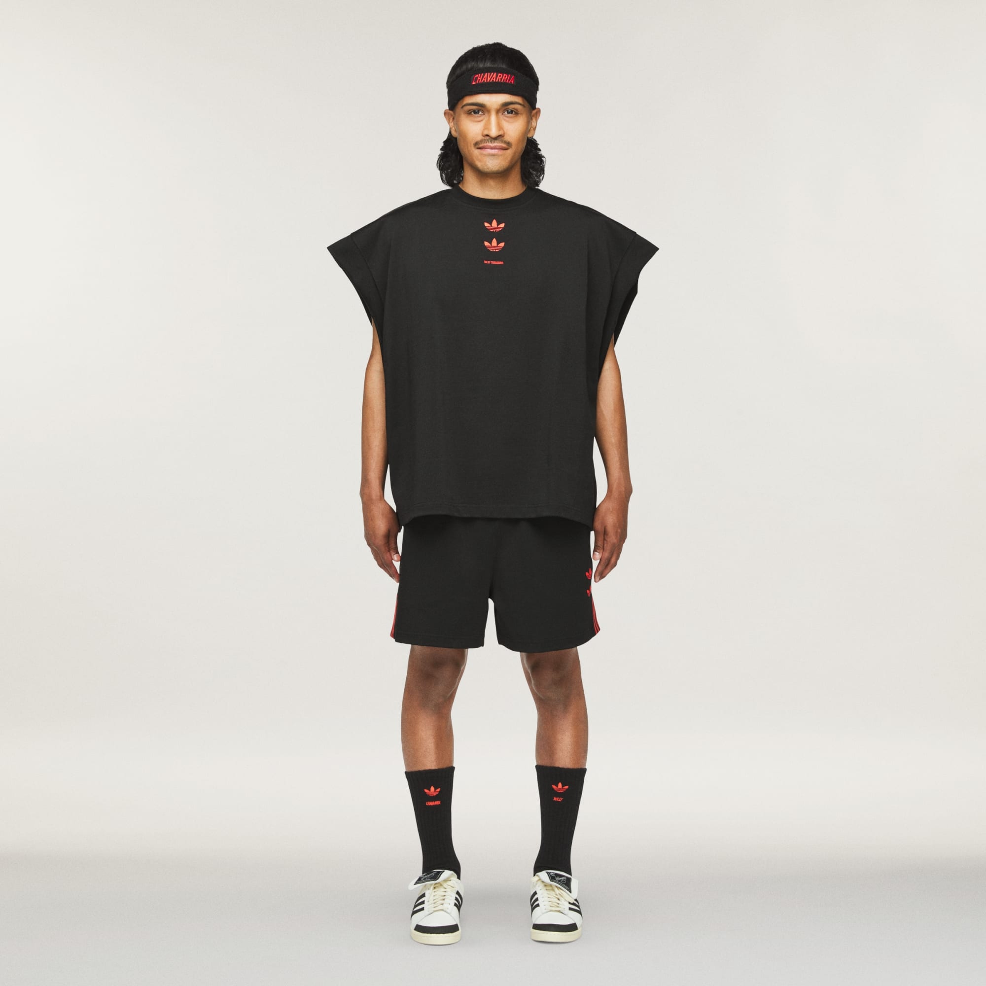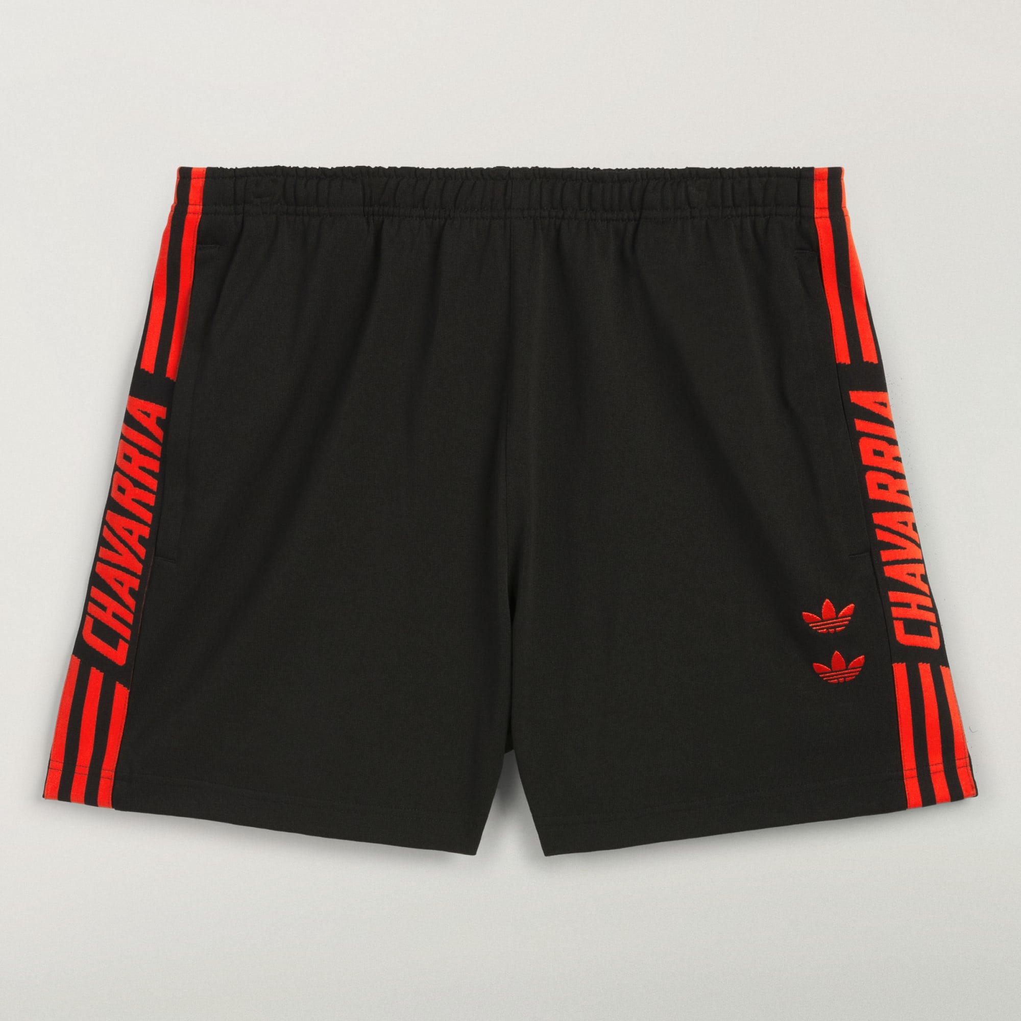 The Chavarria Gym Short is elevated in a heavyweight jersey fabric to provide exceptional quality and comfort. Functional details include drawcords and side pockets. Branding is symbolized by embroidered double trefoils on the wearer's left hip. Adidas applied stripes appear on each leg in two segments, with Chavarria on the side.
