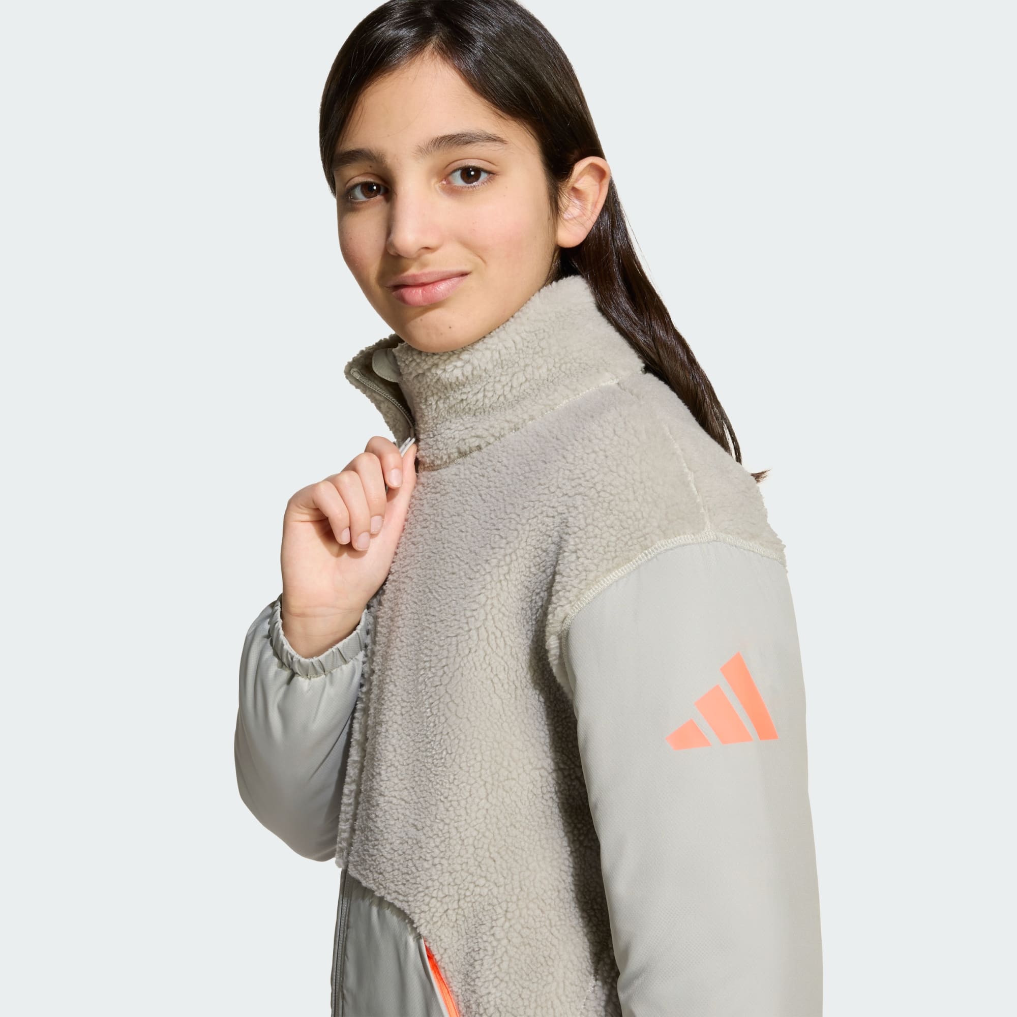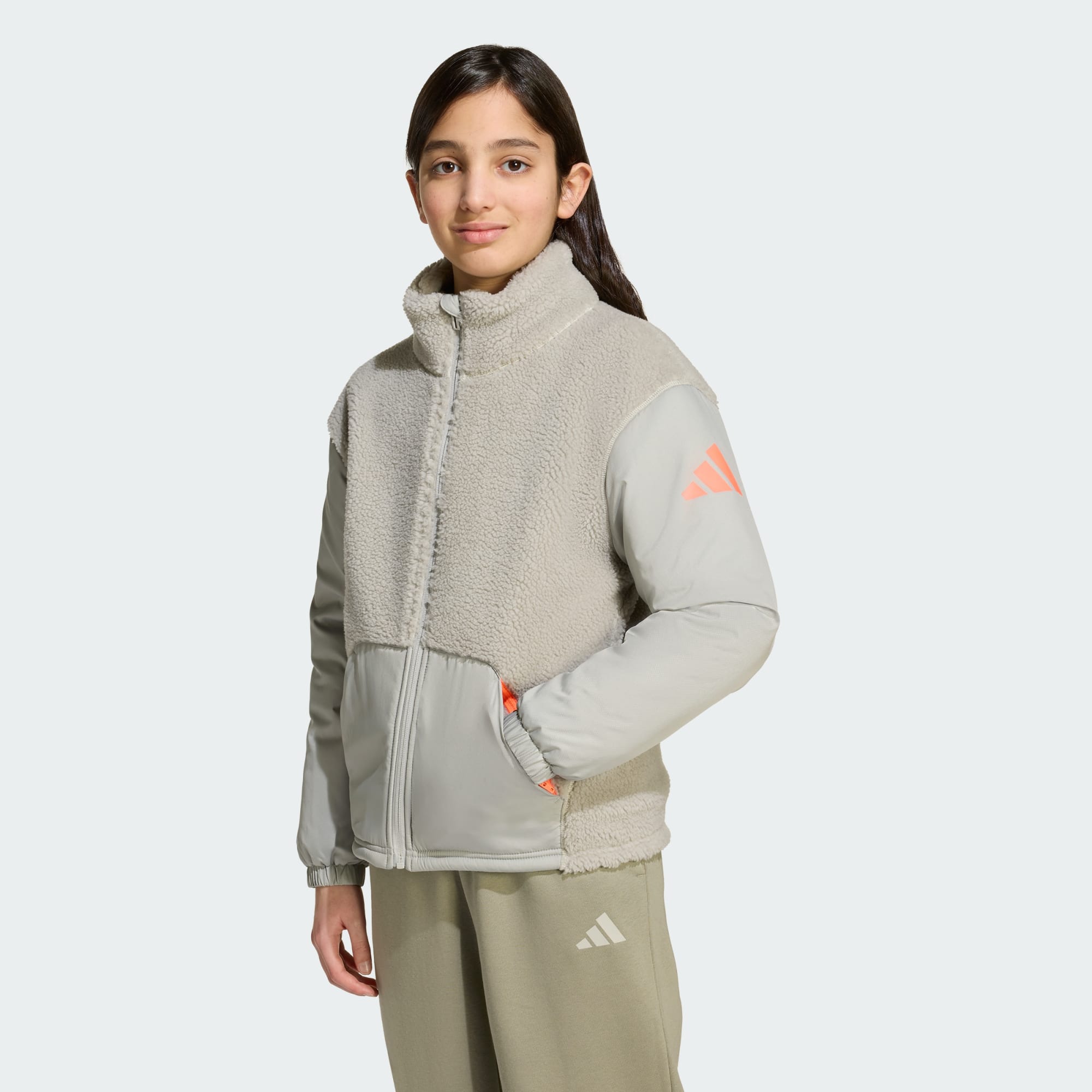 Warm and cosy for cold-weather adventures, this juniors' jacket from adidas keeps chills at bay with a soft fleece lining and padded sleeves. Zipper pockets stow essentials securely, and a phone pocket and inner name label tag add extra practicality for winter exploring. Embrace outdoor adventure in comfort and style in this high-neck, full-zip jacket that you can layer under a shell or wear on its own.