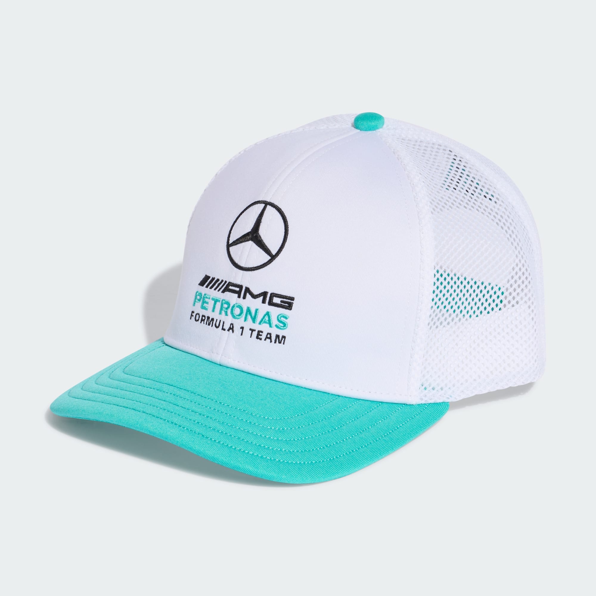 Flatbrim cap with embroidered Mercedes logo for motorsport fans.