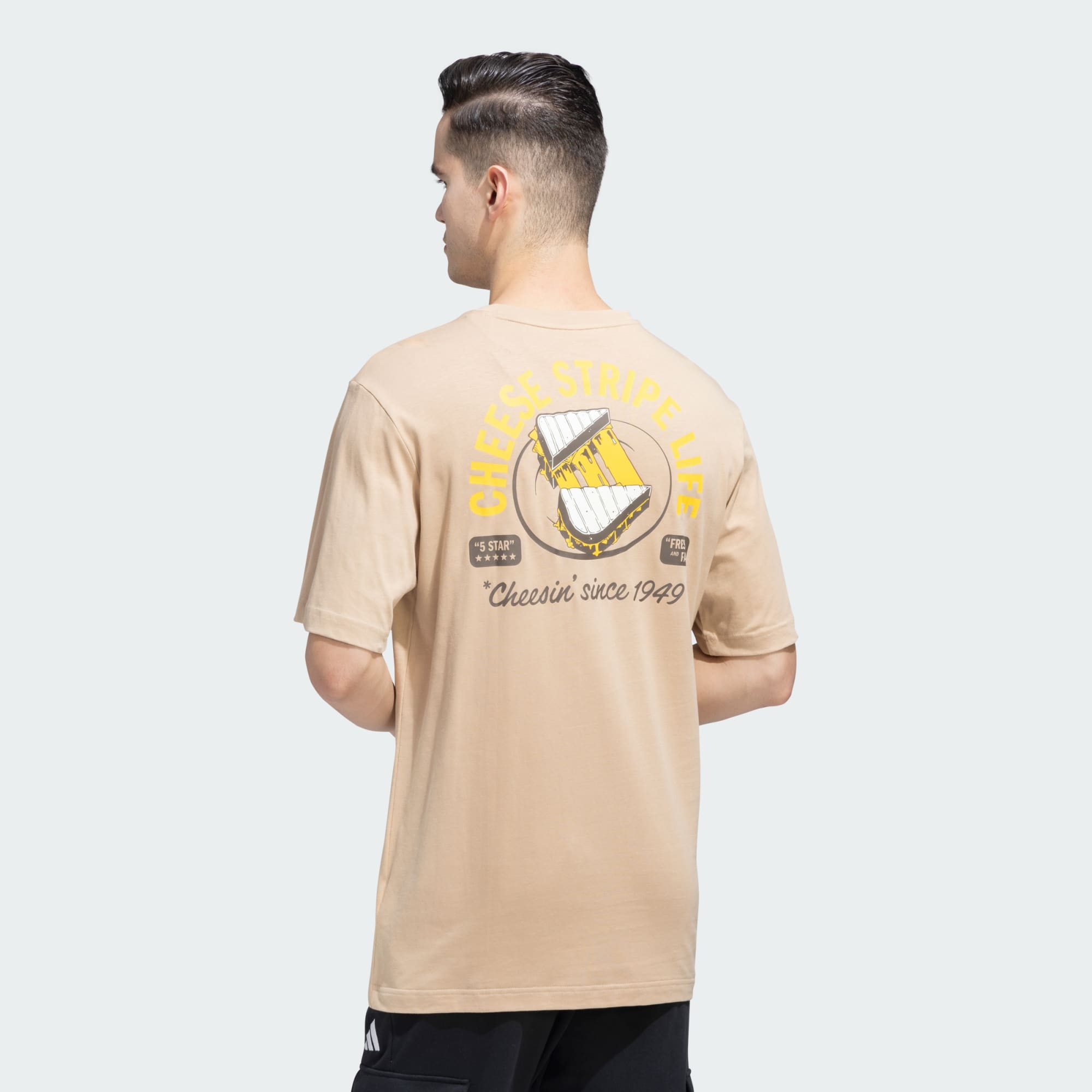 Enjoy the cheese stripe life with this adidas Cheese Tee. Adidas has been cheesin’ you since 1949. Show off your cheesy moments and brand love wherever you go with these graphic print t-shirt. Pair it with your favourite joggers to enjoy your cheesy moments with comfort.